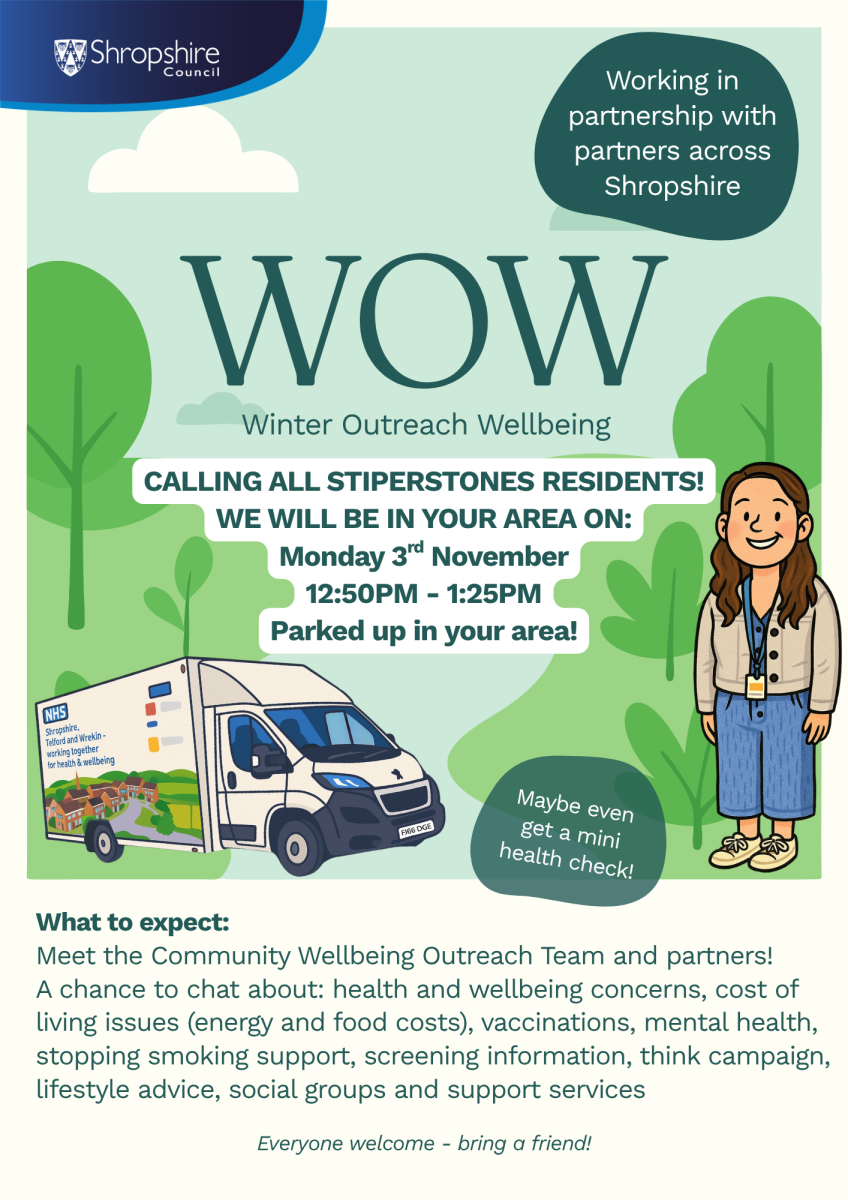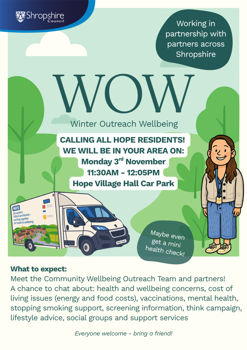We are excited to let you know that on Monday 3rd November, the (CWOT) will be visiting; Hope, Snailbeach and Stiperstones as part of the WOW (Winter Outreach Wellbeing) Project!