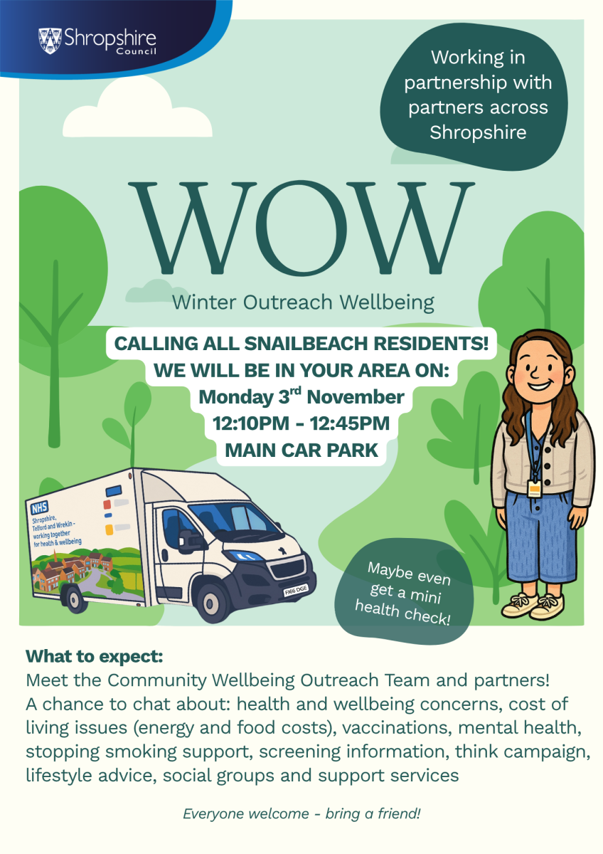 It will be an opportunity for local residents to visit the CWOT van, meet the CWOT team and get information and support on a range of health and wellbeing needs, such as: